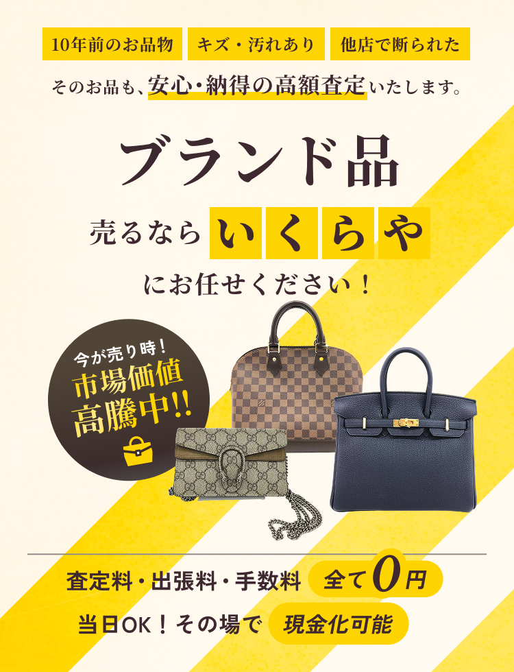 ブランド品買取では、ルイ・ヴィトンやエルメス、シャネルなどの高級ブランドから、時計・ジュエリー・バッグ・アパレルまで幅広く査定・買取を行います。状態が良好な品はもちろん、使用感のあるアイテムや古いモデルでも価値が見込める場合があります。付属品や箱、ギャランティカードが揃っていると査定額がさらにアップする傾向にあります。当店は最新の市場相場と豊富な買取実績をもとに、公平で高価な査定を実現。全国からの宅配買取、店頭持ち込み、出張買取にも対応し、迅速・丁寧な対応でお客様の大切なブランド品を安心してお売りいただけます。買取について、「いくらや」へお気軽にご相談ください。