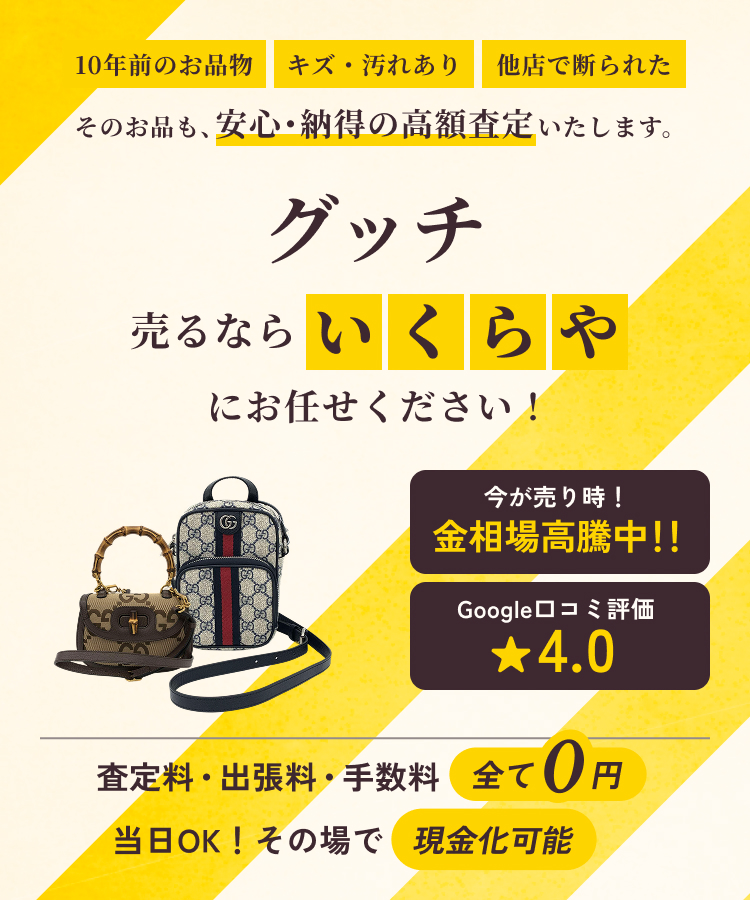 グッチは1921年にイタリア・フィレンツェで創業された世界的ラグジュアリーブランドで、GGロゴやシェリーラインをあしらったバッグや財布、アパレルが人気です。高品質な素材と洗練されたデザインで、幅広い世代から支持を集めています。中古市場でも需要が高く、定番アイテムや限定コレクションは高価買取の対象となることも。グッチ製品は状態やモデルによって査定額に差はあるものの、ブランド力が強いため売却時にも安定した価格が期待できます。買取について、「いくらや」へお気軽にご相談ください。