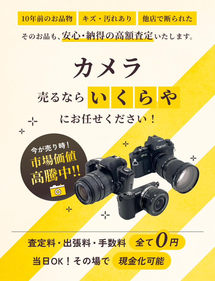 カメラは、メーカーやモデル、状態によって買取価格が大きく変動する精密機器です。ライカ、ニコン、キヤノン、ソニー、富士フイルムなどの有名ブランドや限定モデル、フィルムカメラの人気機種は中古市場でも高い需要があります。レンズやアクセサリーが揃っていると評価がさらに上がり、防湿庫で保管されていた良好な状態の品は高額査定が期待できます。動作確認済みで故障や傷が少ないほど有利です。当店では最新の市場相場を踏まえ、専門鑑定士が一点ずつ丁寧に査定し、適正価格で買取いたします。買取について、「いくらや」へお気軽にご相談ください。