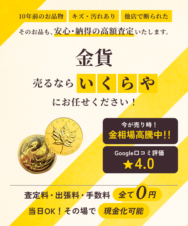 金貨は金の含有量が高く、資産価値とコレクション性を兼ね備えた貴金属製品です。主に投資目的や記念品として発行され、種類によっては発行年やデザインの希少性が高く評価されることもあります。代表的なものにカナダメイプルリーフ金貨やウィーン金貨、天皇陛下御在位記念金貨などがあり、純度の高さと保存状態によって買取価格が大きく変動します。不要になった金貨は査定次第で高価買取が期待できます。買取について、「いくらや」へお気軽にご相談ください。