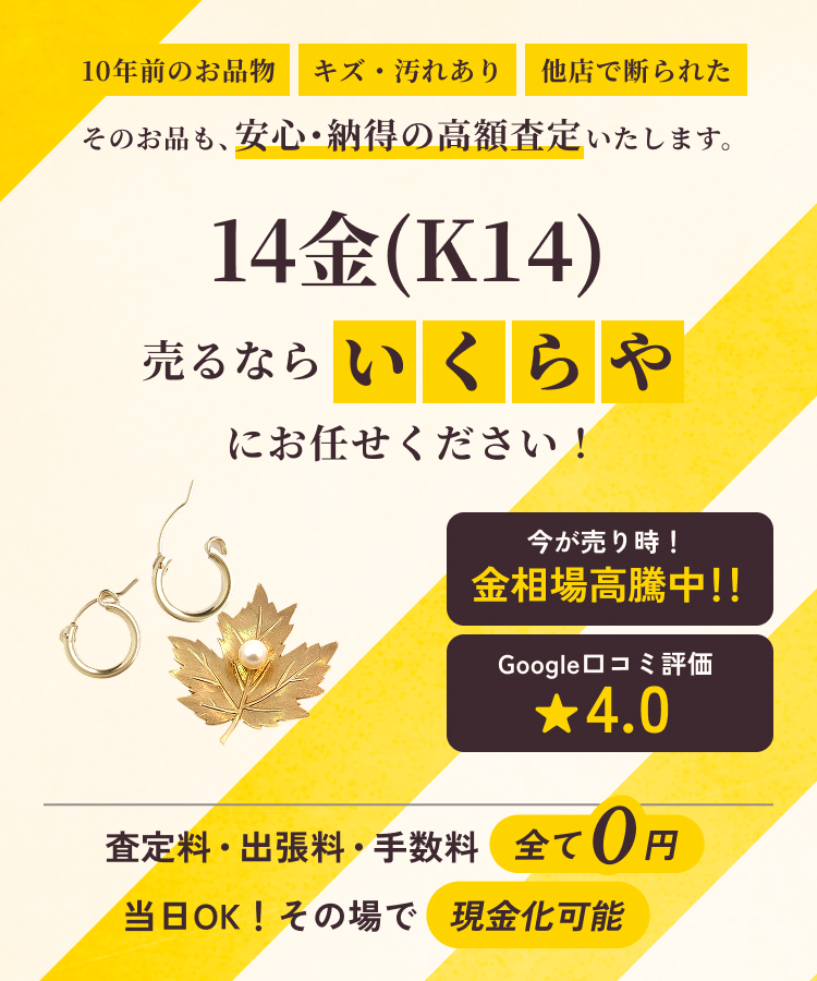 14金(K14)は金の純度が約58.5%で、銀や銅などが混ざることで強度と耐久性が高められています。純金より硬いため、日常使いに適したジュエリーやアクセサリーによく使われます。耐久性と美しい輝きを兼ね備え、幅広いデザインに対応可能です。買取市場でも需要があり、刻印や重量が明確なら正確な査定ができます。買取について、「いくらや」へお気軽にご相談ください。
