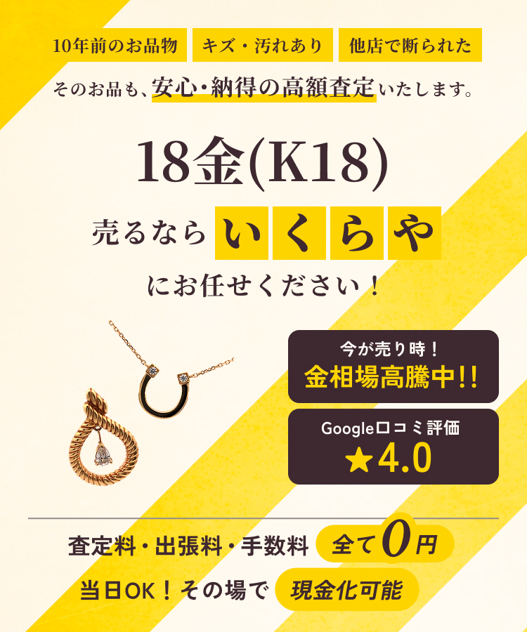 18金(K18)は、金の純度が75%で、残りは主に銀や銅などの金属で構成されています。純金よりも硬く耐久性が高いため、ジュエリーやアクセサリーに広く用いられています。美しい黄金色を保ちながら、日常使いに適した丈夫さが特徴です。買取市場でも人気が高く、刻印や重量が明確であれば正確な査定が可能です。不要な18金製品は高価買取が期待できます。買取について、「いくらや」へお気軽にご相談ください。