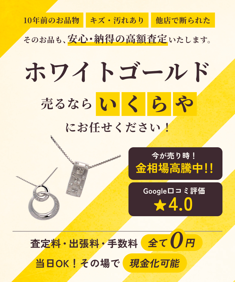 ホワイトゴールドは、金にパラジウムやニッケルなどの白色金属を混ぜて作られる、洗練されたシルバー色が特徴の貴金属素材です。18金(K18)や14金(K14)で展開され、耐久性と美しい光沢を兼ね備えているため、指輪やネックレス、イヤリングなどのジュエリーに広く使用されています。ホワイトゴールドはデザイン性やブランドによって価値が変動しますが、買取市場でも人気が高く、高額査定が期待できる素材です。買取について、「いくらや」へお気軽にご相談ください。