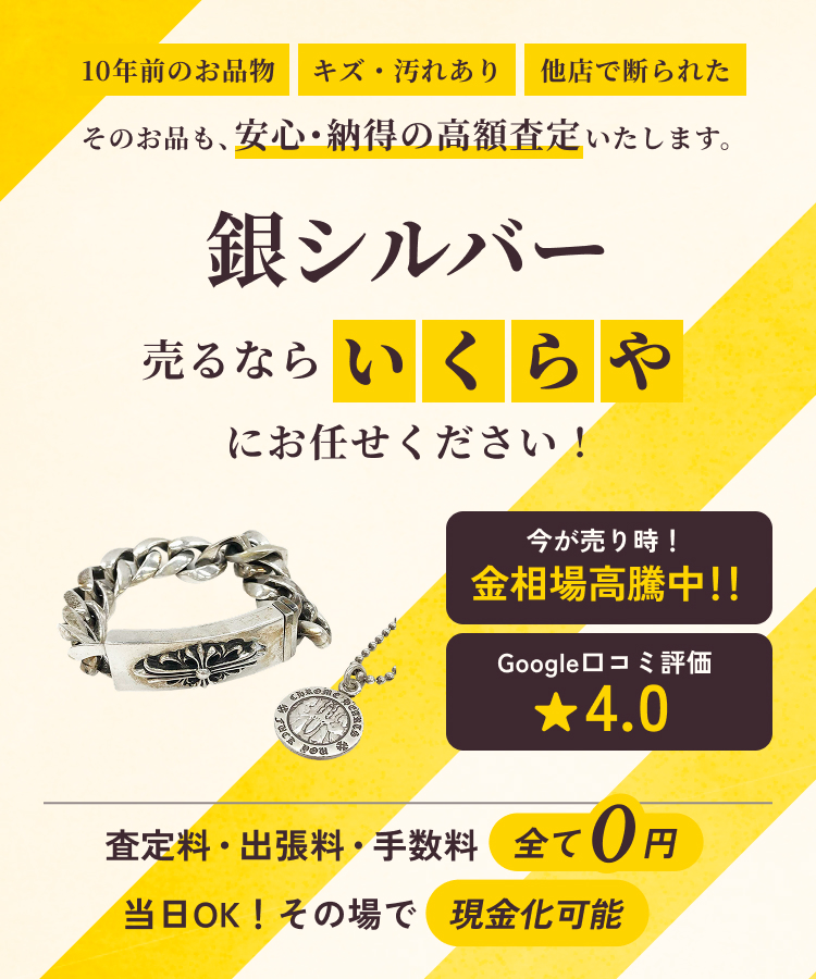 銀製品は多くの場合、溶解して再利用されるため、多少の傷や汚れは査定額に大きな影響を与えません。しかし、ネックレス・指輪・ブランドジュエリーなど、そのまま販売される可能性がある品は、汚れや傷が減額要因になることがあります。やわらかい布で軽く手入れしてから持ち込むと安心です。