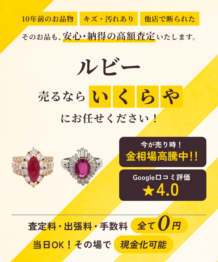 ルビーは、鮮やかな赤色が特徴のコランダム系宝石で、「情熱」や「愛」の象徴として古くから愛されてきました。特に深く鮮やかな赤色の「ピジョンブラッド」は希少価値が高く、高額査定の対象となります。色の濃さや透明度、カットの美しさ、カラット数、産地が価値を大きく左右し、ミャンマー産などは特に人気です。ブランドジュエリーやオリジナルの鑑別書が付属するルビーは、真贋や品質が明確になり、買取価格の向上につながります。買取について、「いくらや」へお気軽にご相談ください。