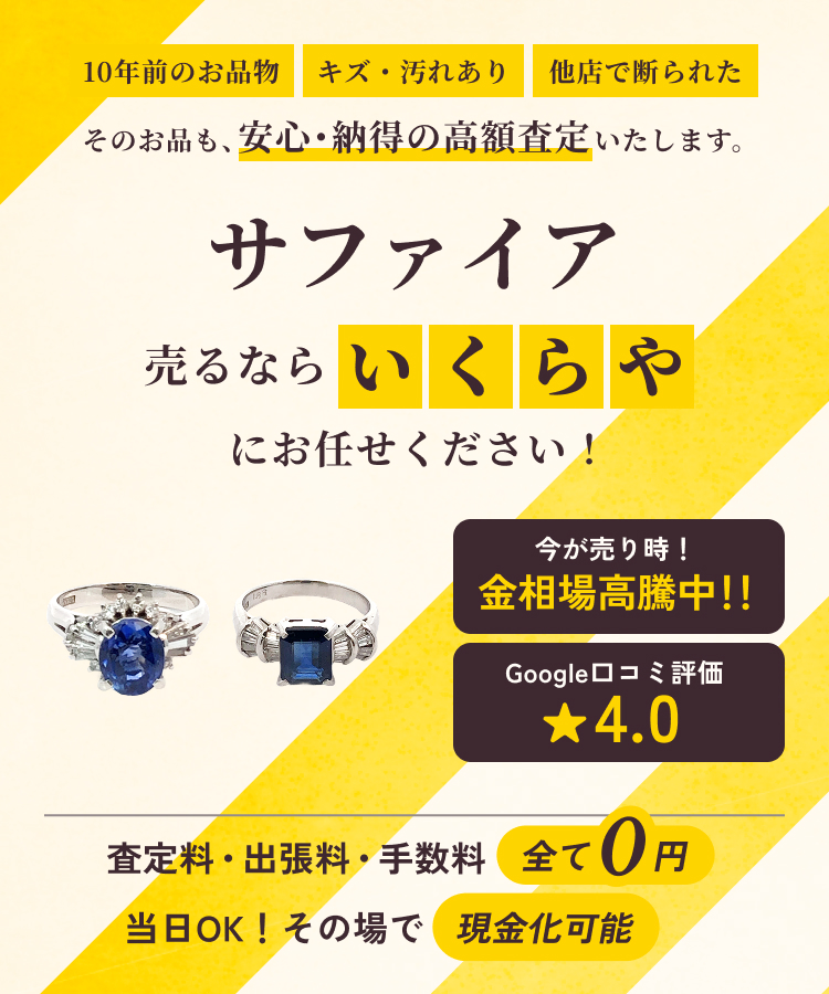 サファイアは、深く鮮やかな青色が特徴のコランダム鉱石で、ダイヤモンドに次ぐ硬度を誇る宝石です。特に濃く透明感のあるロイヤルブルーは希少性が高く、高額査定の対象となります。色合いや透明度、カットの美しさ、カラット数、産地が価値を左右し、カシミール産やパパラチアサファイアなどは特に人気です。指輪やネックレスなどのジュエリーはブランドやデザイン性も評価ポイント。鑑別書があるとさらに信頼性が高まり、買取価格アップにつながります。買取について、「いくらや」へお気軽にご相談ください。