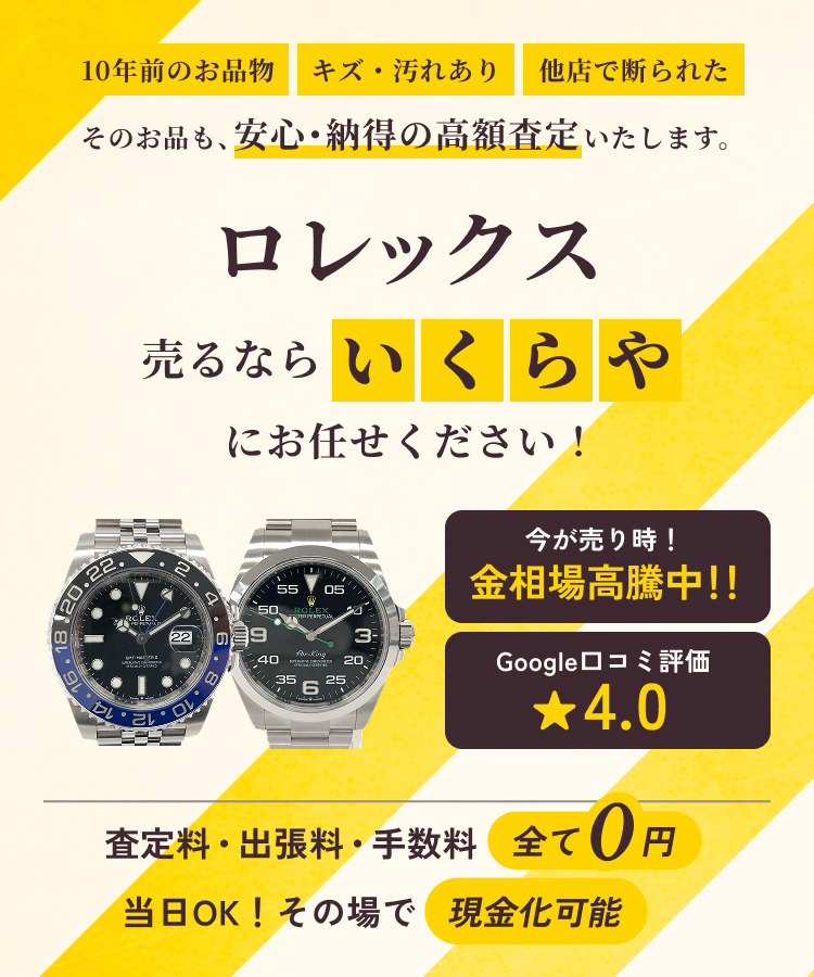 ロレックスは、スイスを代表する高級腕時計ブランドで、精密な技術と耐久性、洗練されたデザインで世界的な人気を誇ります。デイトナ、サブマリーナー、エクスプローラーなどの定番モデルは中古市場でも高値で取引されており、資産価値の高さが特徴です。需要が非常に高いため、状態や付属品の有無に関わらず高価買取が期待できます。ロレックスの買取について「いくらや」へお気軽にご相談ください。