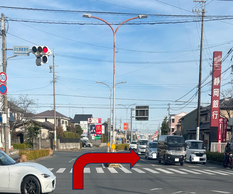 浜松葵郵便局交差点を右折します。(静岡銀行と郵便局が目印)