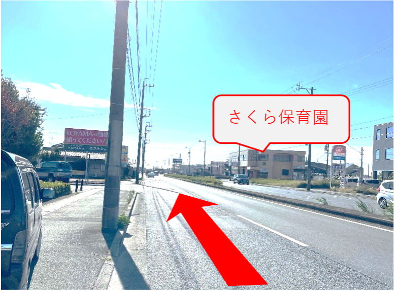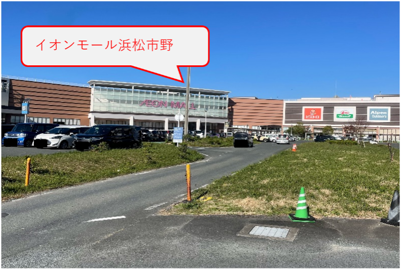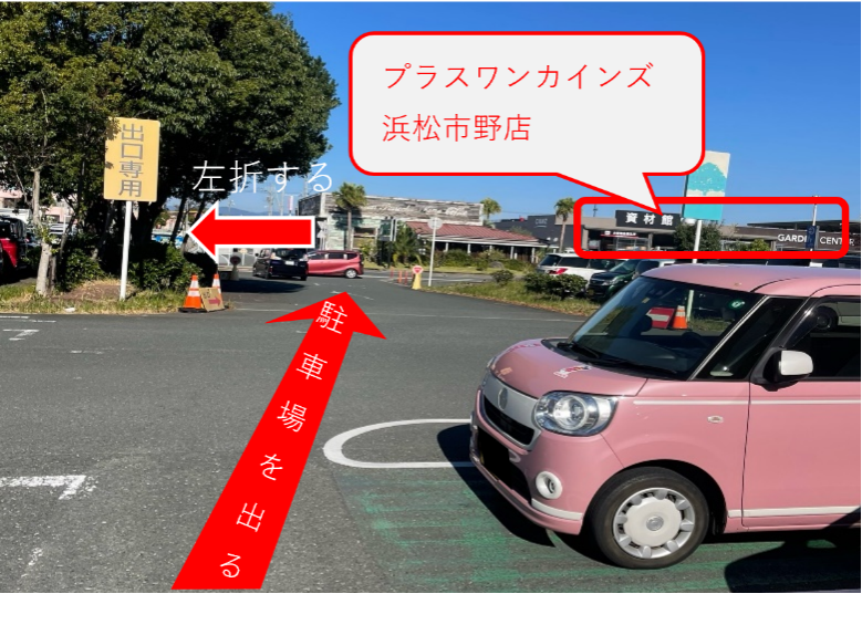 プラスワンカインズ浜松市野店側の駐車場出口から出て左折し、600mほど直進してください。(約2分)