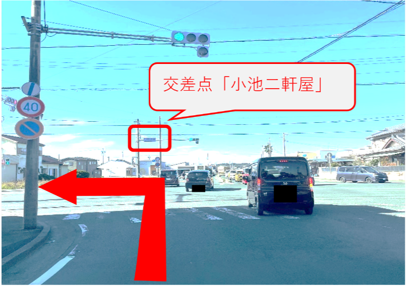 「小池二軒屋」交差点の信号を左折し、船越パイパスにお入りください。