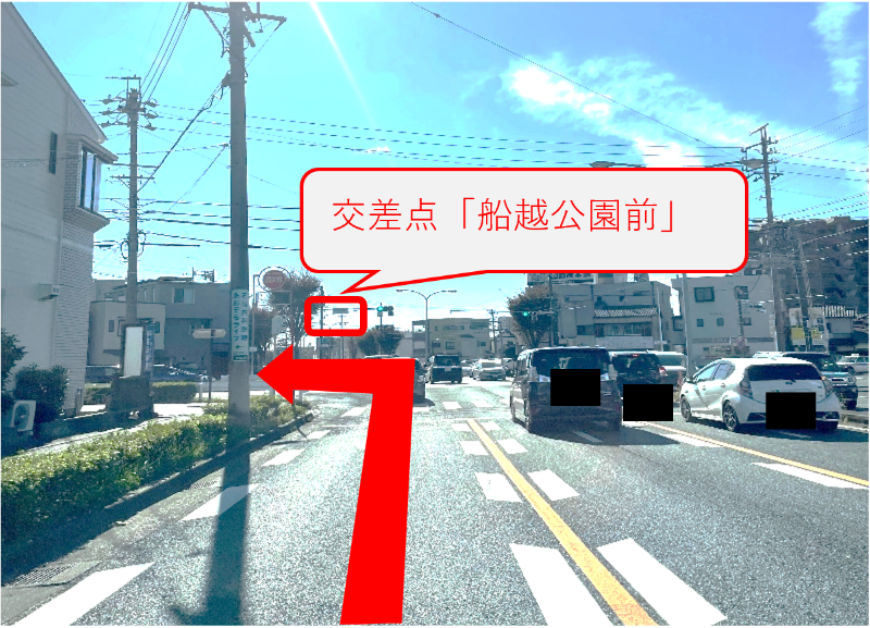 「船越公園前」交差点の信号を左折し、柳通りにお入りください。
