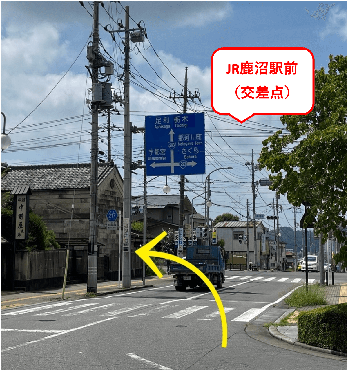 JR鹿沼駅を出て、県道217号を進み、「JR鹿沼駅前(交差点)」を左折し、 鹿沼駅西通りに入る。