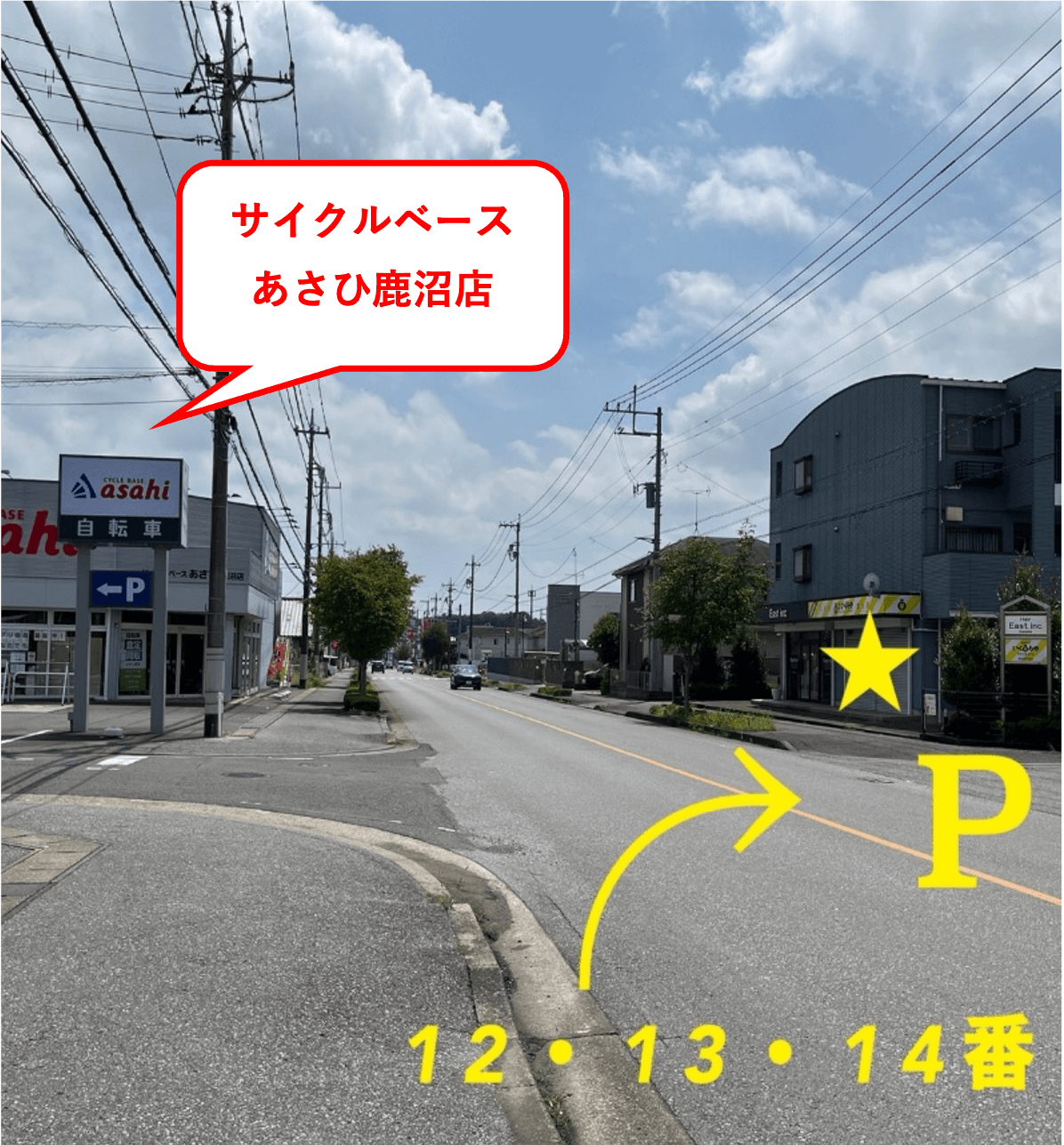 「サイクルベースあさひ鹿沼店」手前の交差点を右折。左手にあるのが当店です。
