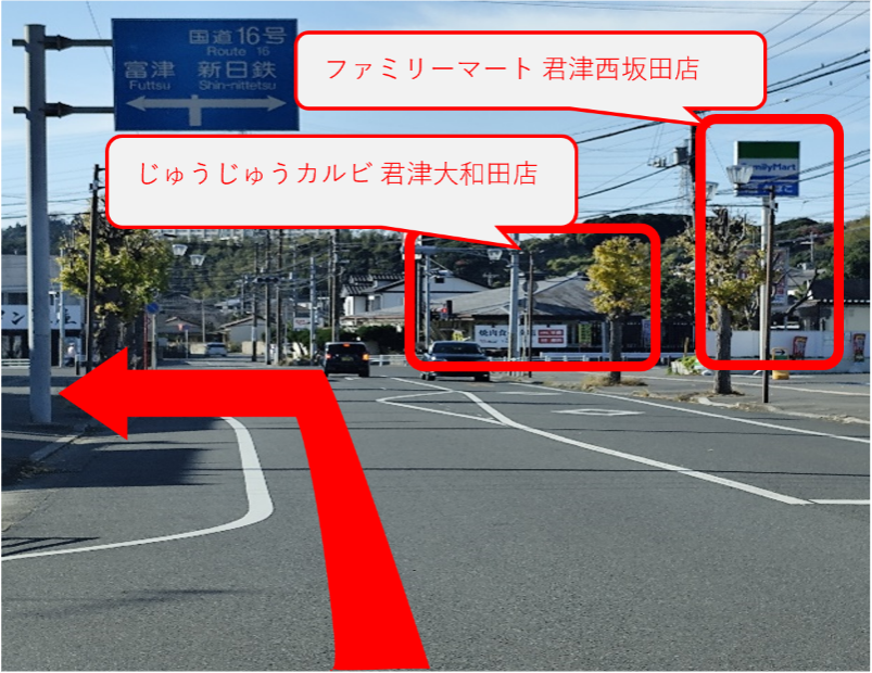じゅうじゅうカルビ 君津大和田店、ファミリーマート 君津西坂田店が見えたら、その先左手が店舗です。