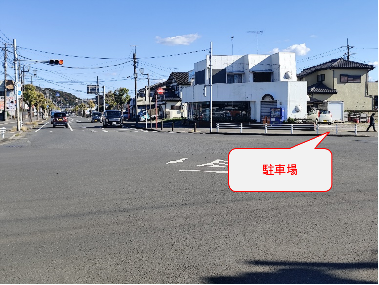 正面左手が店舗入り口、右手奥が駐車場入り口です。