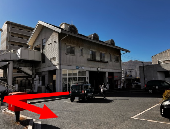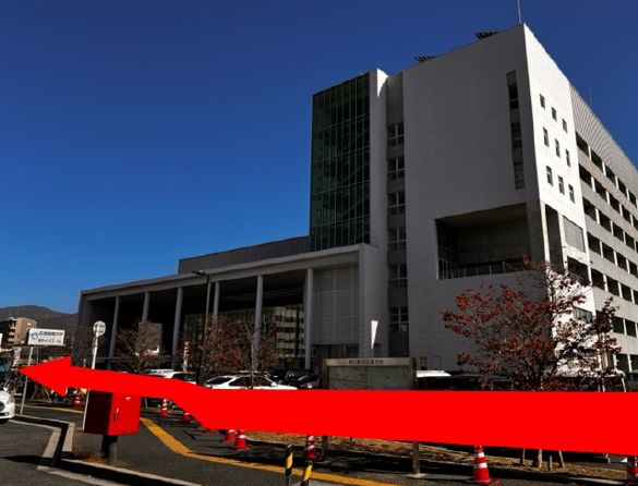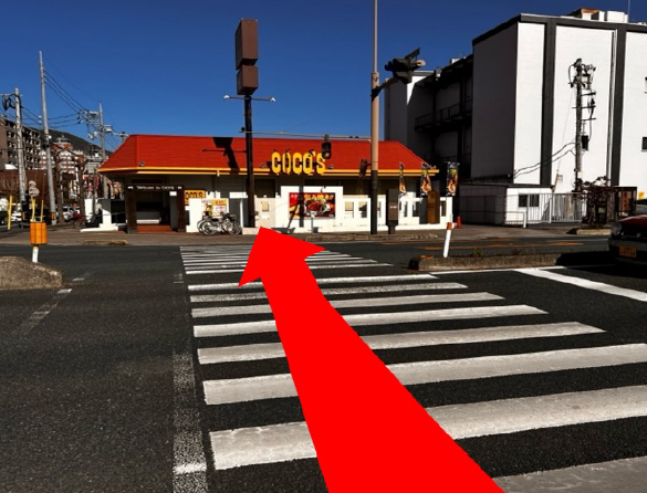 広支所を過ぎた「広支所前」交差点を左折にて横断歩道を「ココス」方面へお進みください