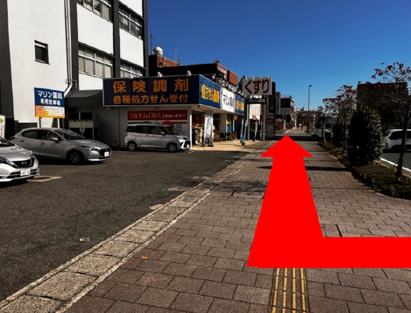 横断歩道を渡りましたら右折にて「マリン薬局」方面へお進みください