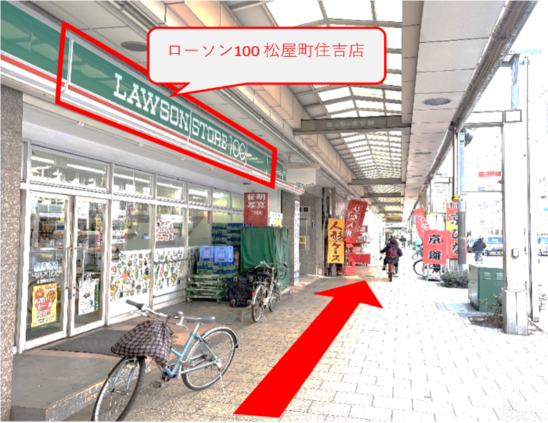 約110m進むと左手にローソン100 松屋町住吉店が見えます。