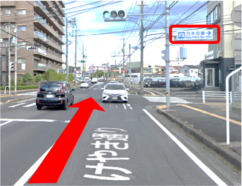 乃木交番の看板を通過し約650m直進します。