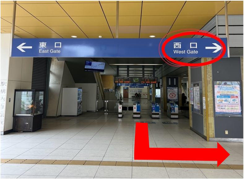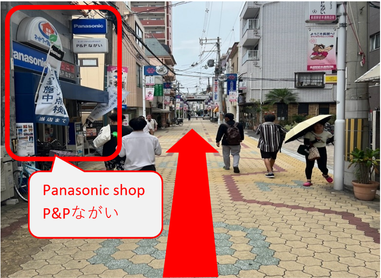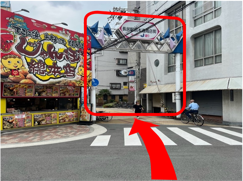 左手のPanasonic shop P&Pながい、右手のchocoZAP長居西口店の間をそのまま直進してください。