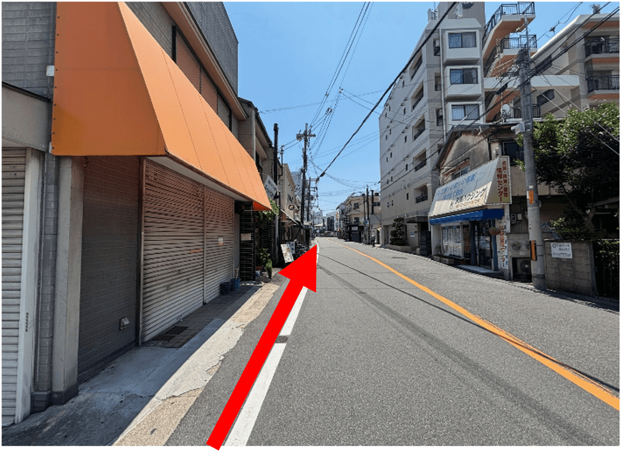 交差点通過後直進します。「萱島駅前」の交差点右折後、100m直進します。