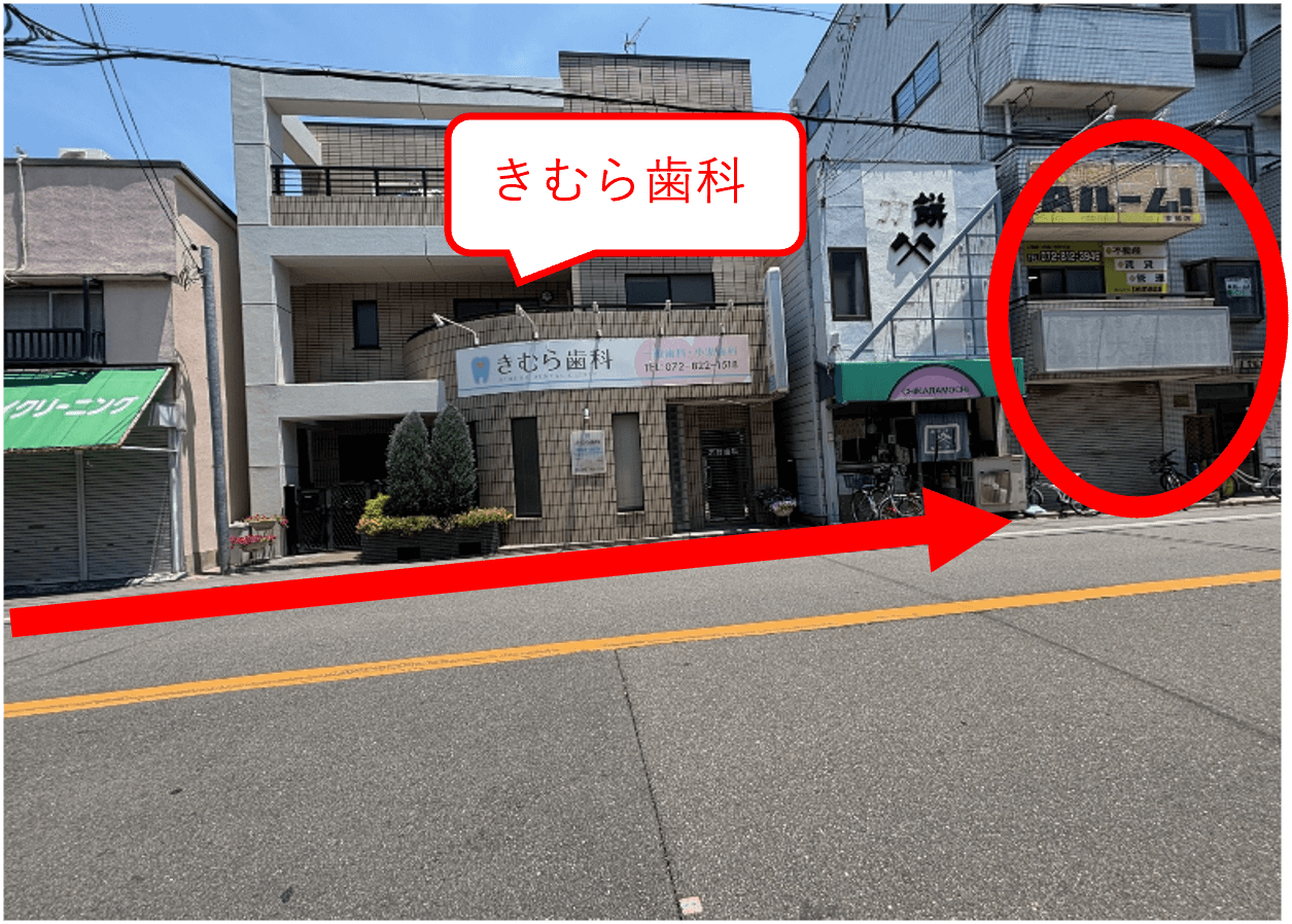 道をまっすぐ進んでいただき、きむら歯科の2軒隣が「いくらや寝屋川萱島店」です!