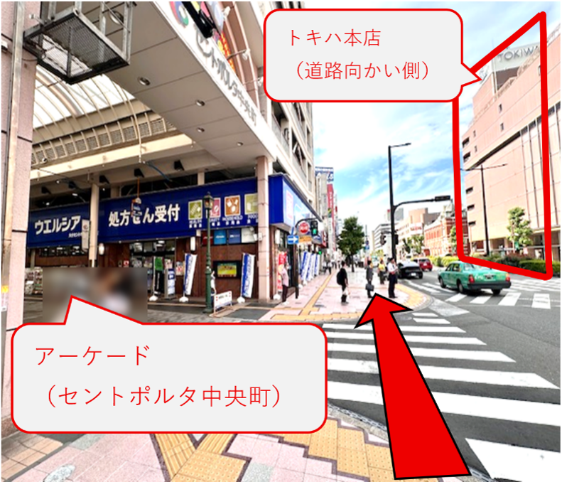 左手にアーケード、道路右向かいにトキハを見ながら直進