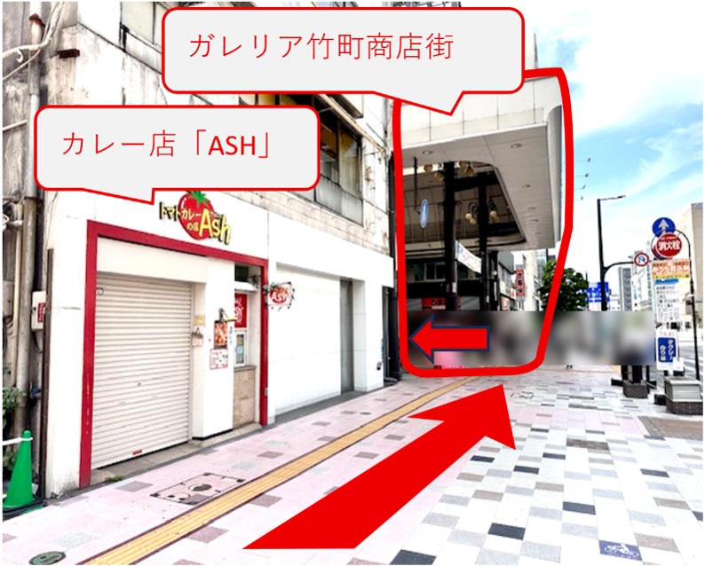 カレー店「ASH」を左折し、ガレリア竹町商店街の中へ