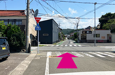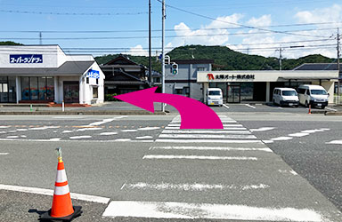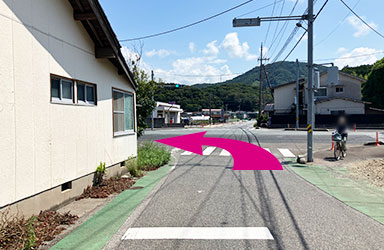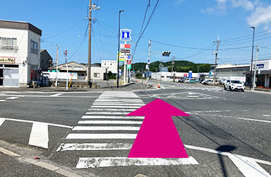右側の横断歩道を渡り、左折します。