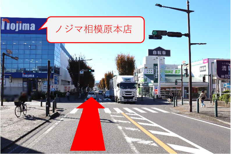 交差点から700m程進むと左手にノジマ相模原本店が見えるので更に直進します。