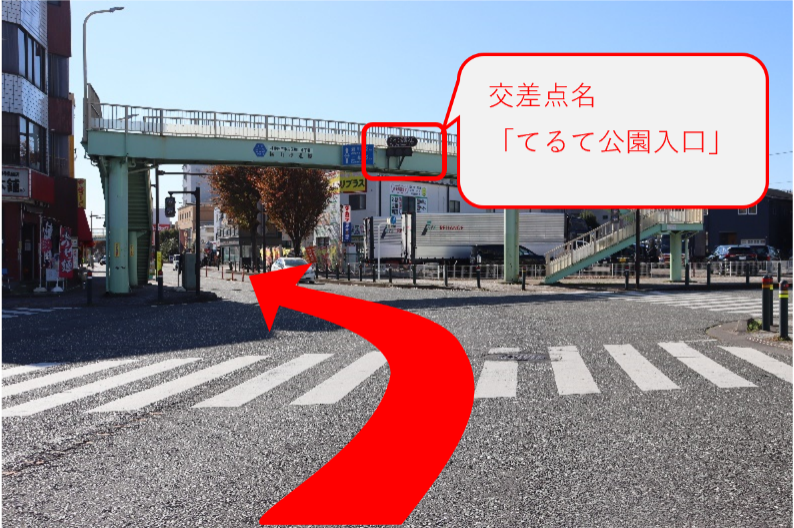 さらに400m程進み、交差点(てるて公園入口)の横山歩道橋の下を斜め左(愛川・上溝法論)方向へ進みます。