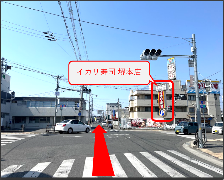 しばらく直進し、イカリ寿司 堺本店のある交差点を越えます。