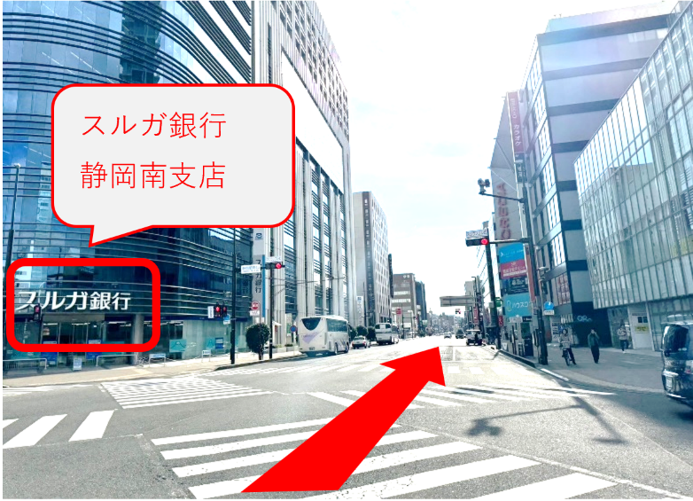 スルガ銀行 静岡南支店を左手に、石田街道を直進してください。