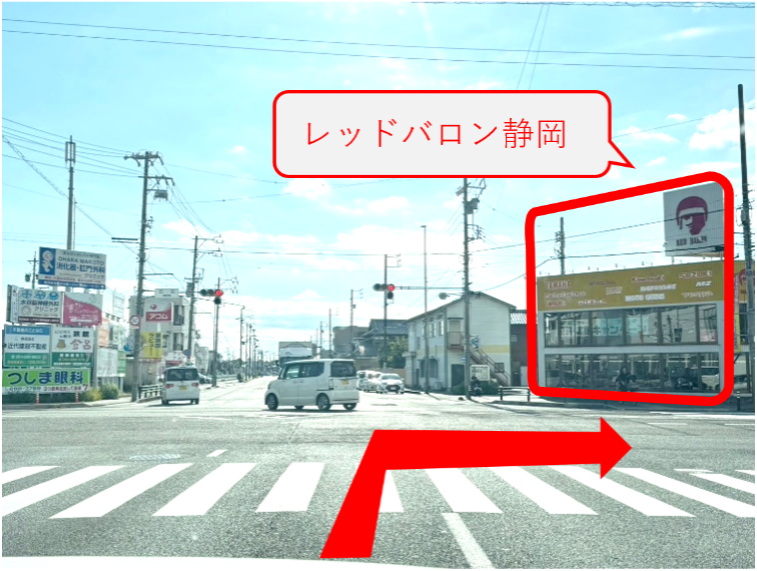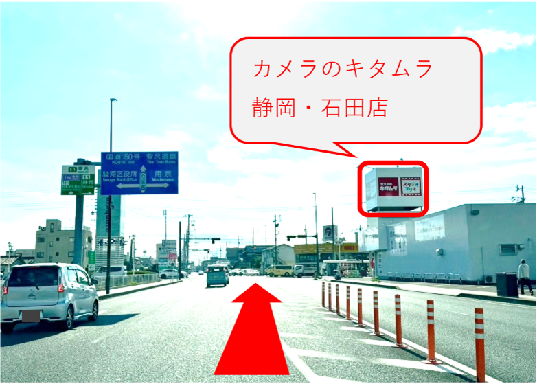 1.7kmほど直進すると、右手にカメラのキタムラ静岡・石田店様とレッドバロン静岡様がある石田交差点に差しかかります。