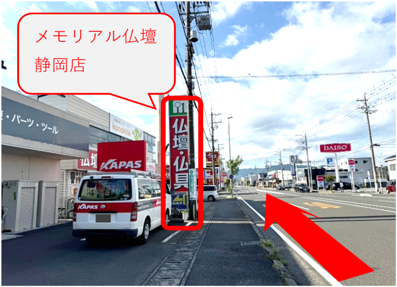 そのまま500mほど直進してください。左手にメモリアル仏壇 静岡店様があり、その奥に当店がございます。