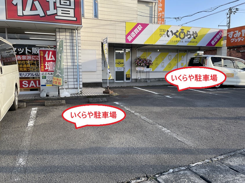 こちらが買取専門いくらや 静岡SBS通り店です。お車でお越しの方は、店舗前駐車場をご利用ください