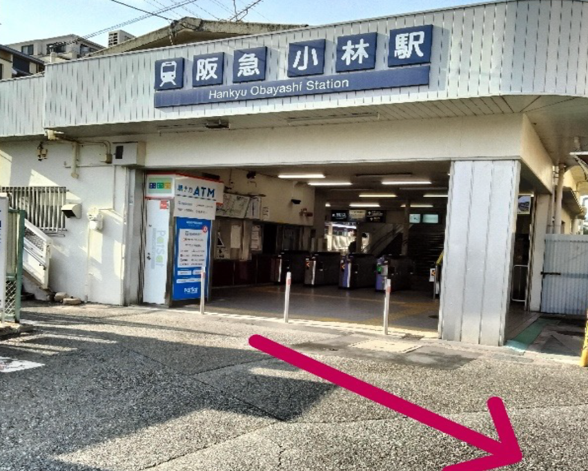 阪急電車今津線の小林駅の東改札口(西宮北口方面側にあります)を出て左方向にお進み下さい。