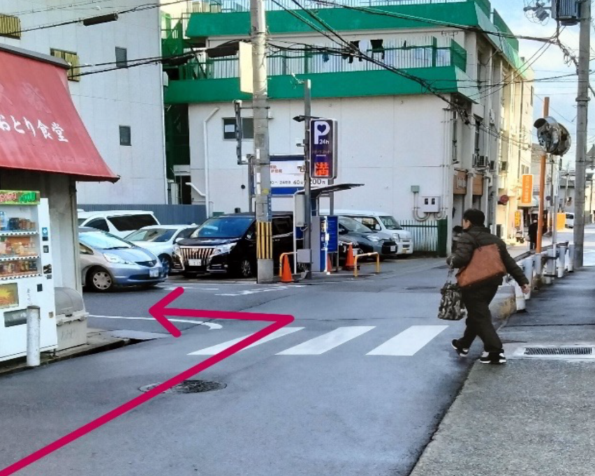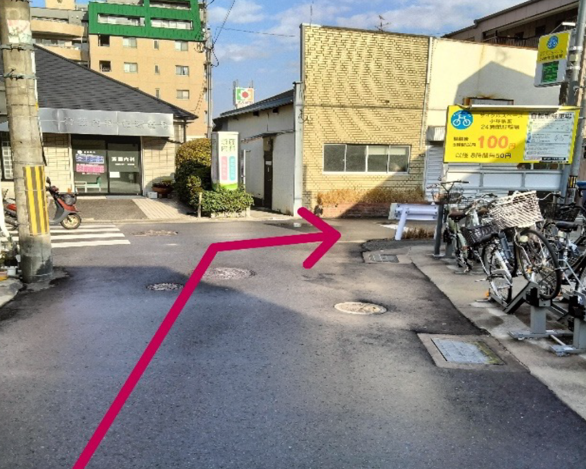 約80mほど行きパークNET小林駅前というコインパーキングのある角を左折して下さい。