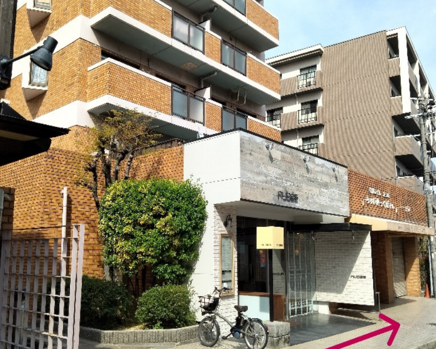 約30m先の左手に外壁がレンガ調のマンションがあり、1Fに店舗が3軒並んでいます。