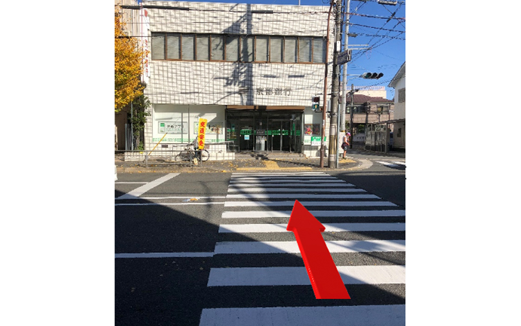 右に曲がってすぐ。 信号機のある横断歩道を渡って左へ。