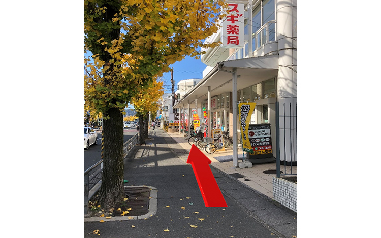 横断歩道を渡って左へ。 スギ薬局様を右手に道なりに約60m進みます。