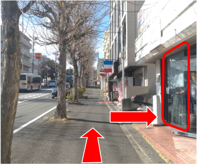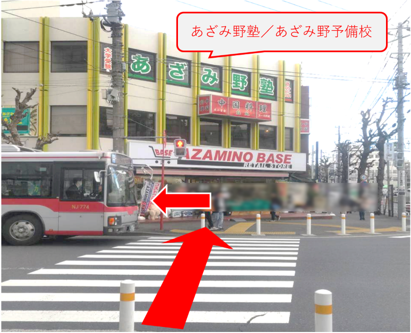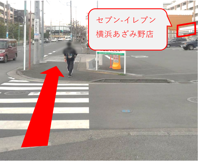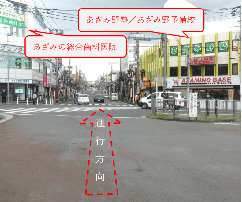 あざみの総合歯科とあざみ野塾前の間の道路に沿って直進します。