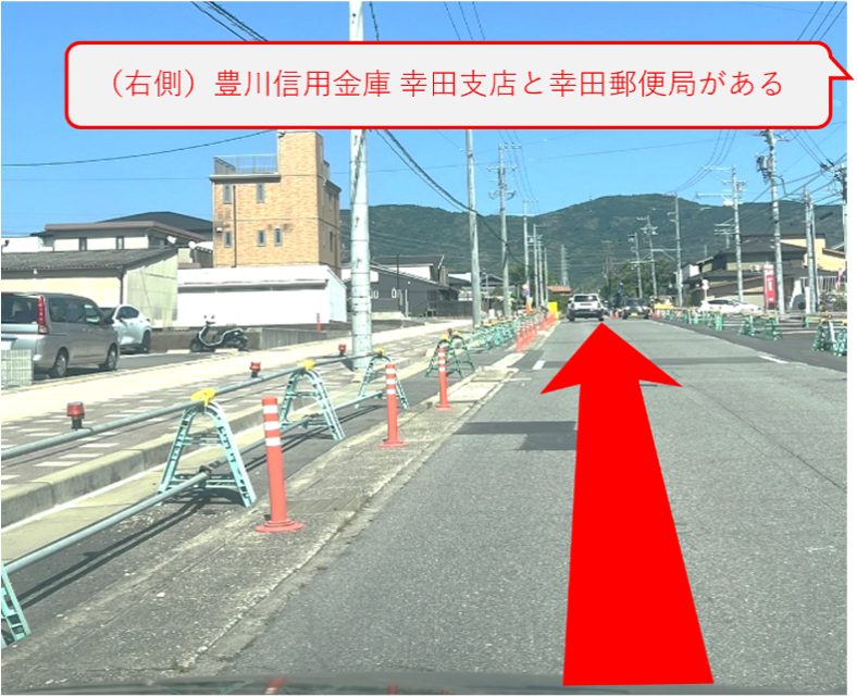 右側の豊川信用金庫 幸田支店、幸田郵便局を通過します