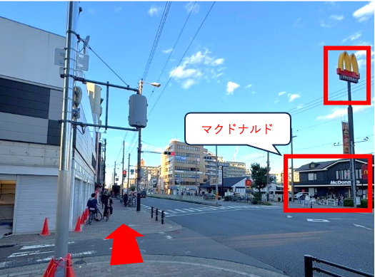 駐車場から駅の方面へ向かって進みます。りそな銀行北巽駅前出張所が目印になります。
