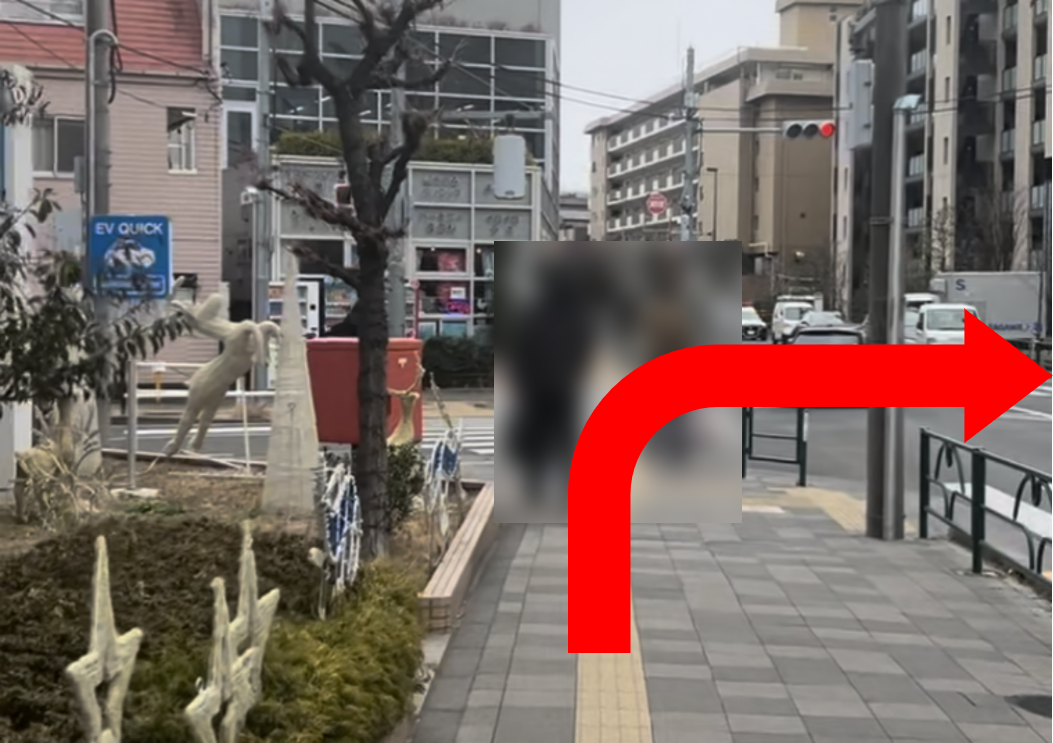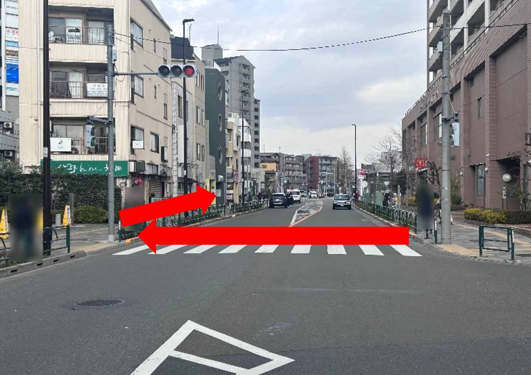 一つ目の信号手前にある横断歩道を右に曲がります。