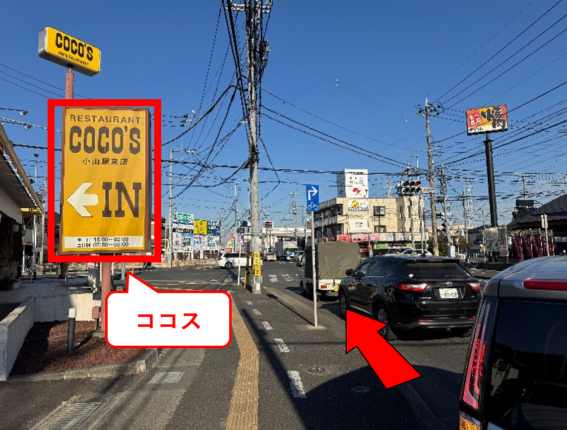左側にココスがある交差点を直進します。