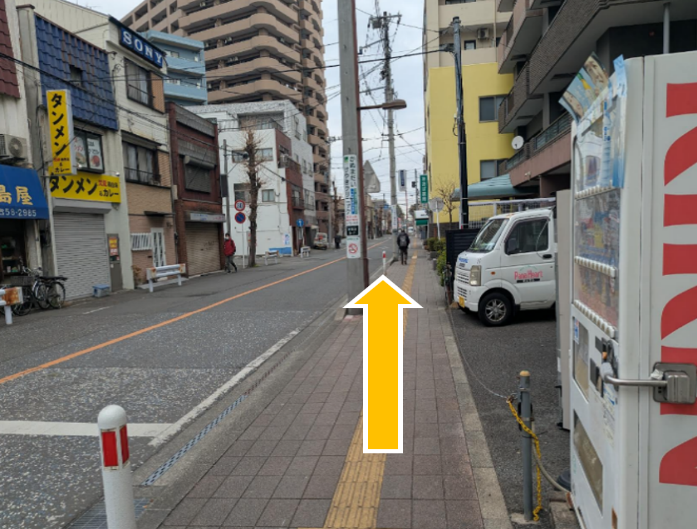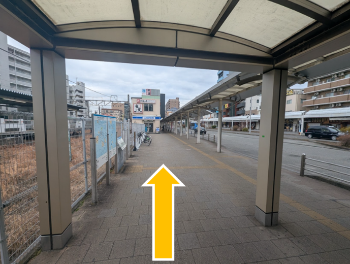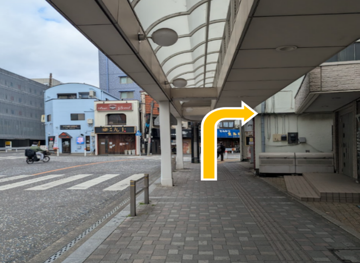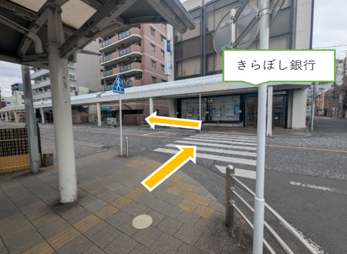「淵野辺駅北口交番」の右手に見える「(株)きらぼし銀行 淵野辺支店」前の横断歩道を渡り、左手に進みます。