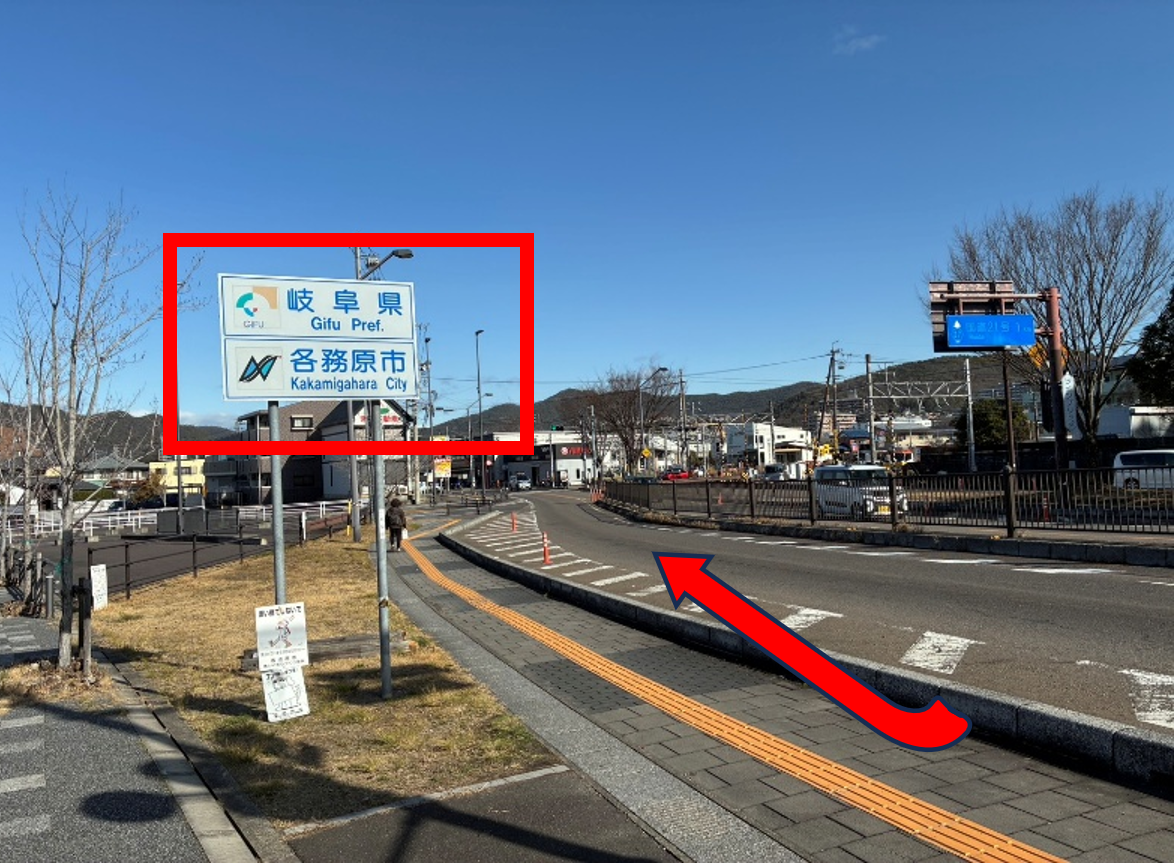 犬山橋を渡ると、「岐阜県各務原市」の看板が見えてきますのでそのまま直進します。