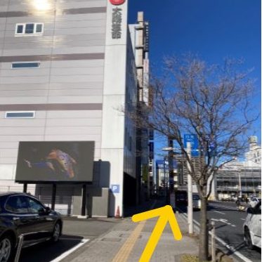 太陽生命ビル横の大型ビジョンが見えてきますのでそのままお進みください。