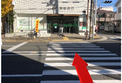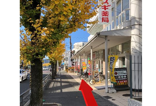 横断歩道を渡って左へ。 スギ薬局様を右手に道なりに約60m進みます。